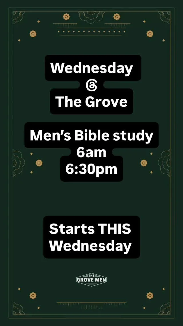The Grove Men meet for Bible Study Wednesdays at 6 AM or 6:30 PM in Room C-100 (August 20 - April 29)!