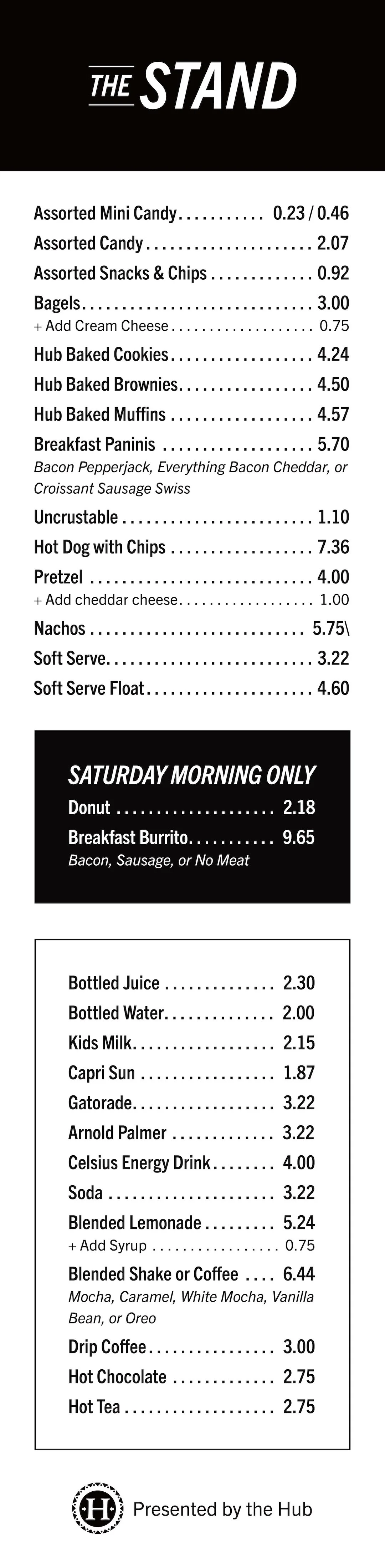 The Stand is located on the west side of campus by the ball fields. Below are the open hours and the available menu.